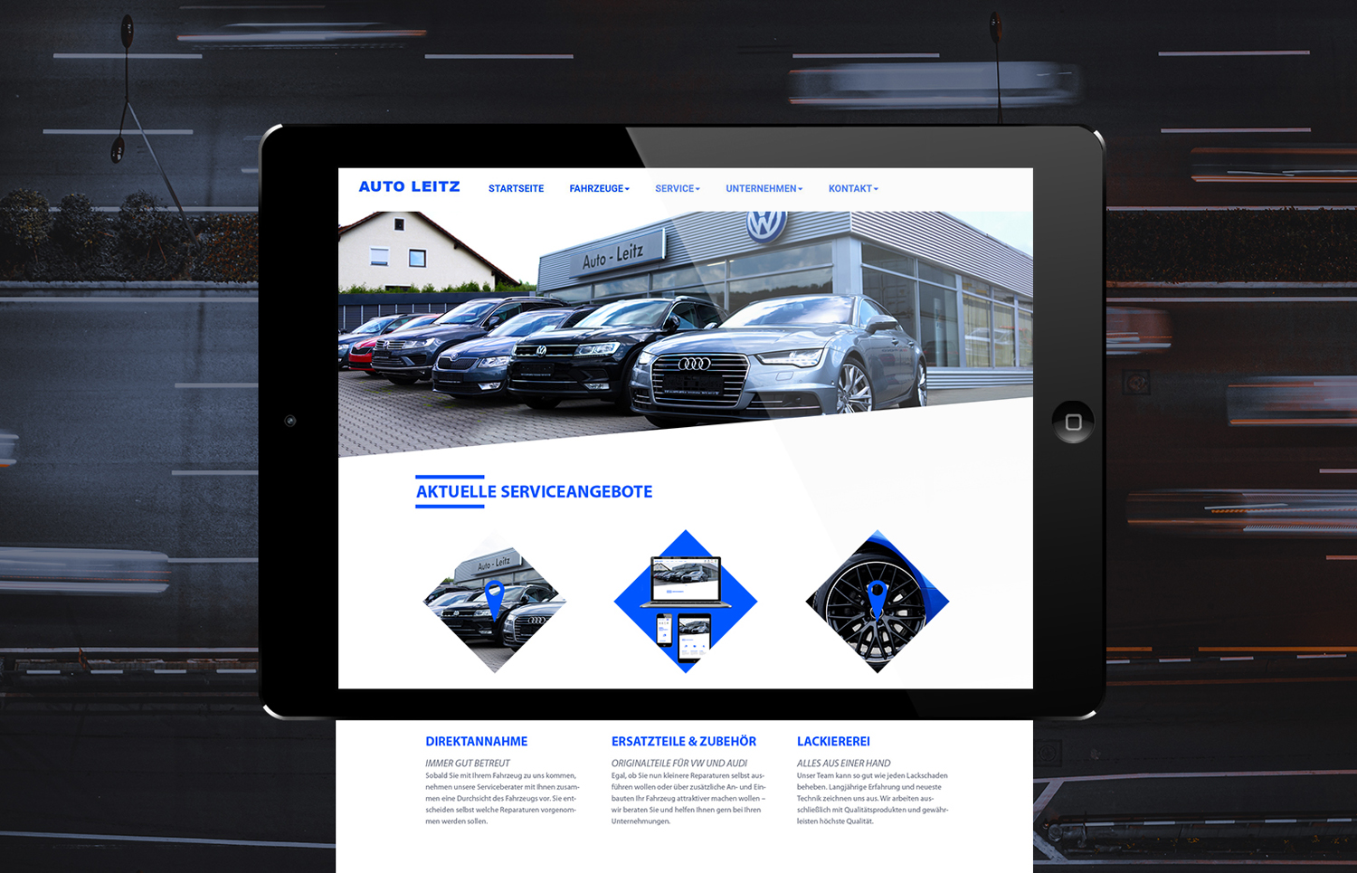 Von der Blauweisen Bayrischen Symbolen ein abgeleitetes Muster. Es wurde ein Fotoshooting mit allen Mitarbeitern des Autohaus Leitz gemacht. Das Muster unterstreicht den Zusammenhalt und Effiktivät des Unternehmens: "Wir sind Auto Leitz"