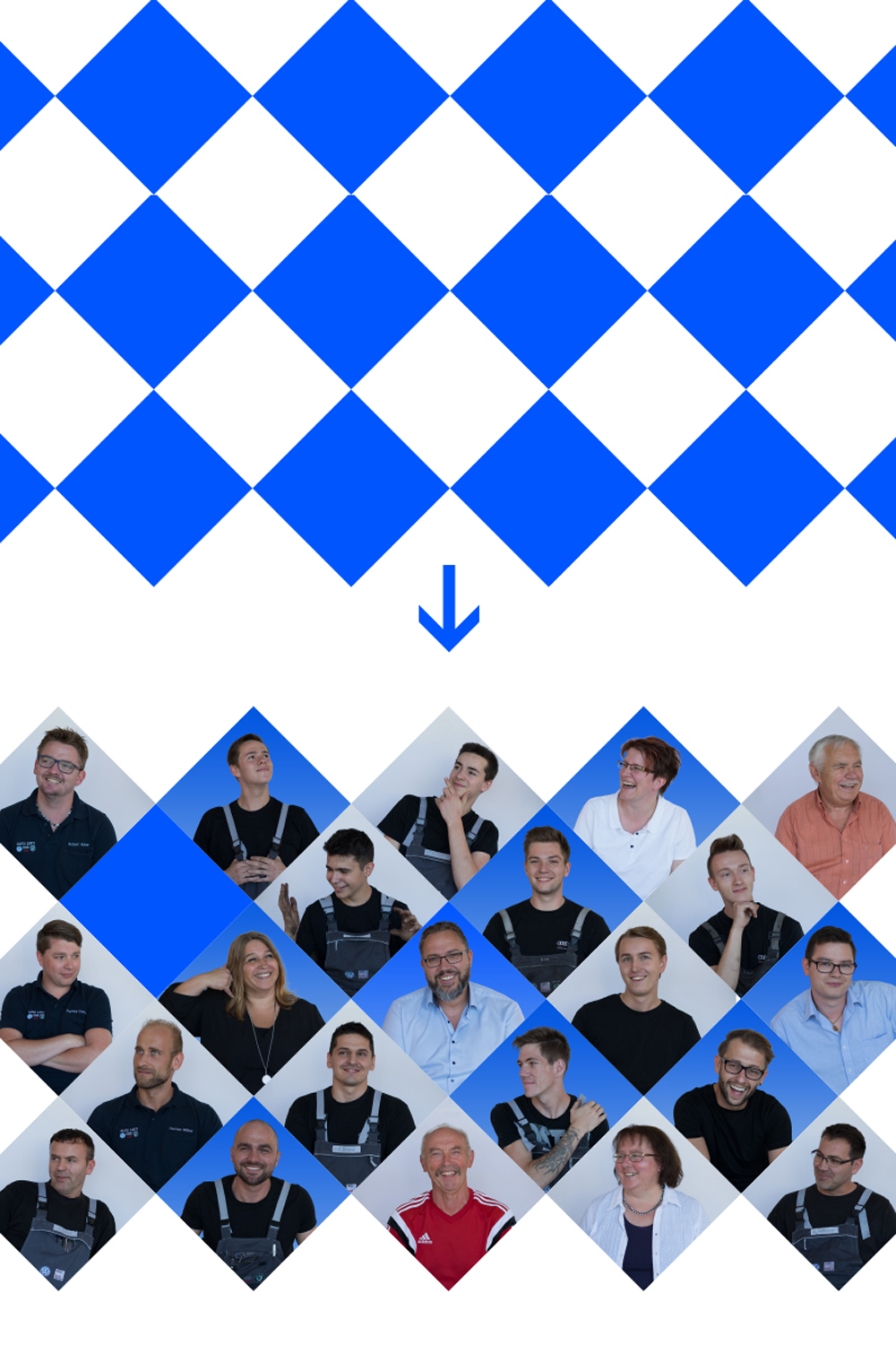 Von der Blauweisen Bayrischen Symbolen ein abgeleitetes Muster. Es wurde ein Fotoshooting mit allen Mitarbeitern des Autohaus Leitz gemacht. Das Muster unterstreicht den Zusammenhalt und Effiktivät des Unternehmens: "Wir sind Auto Leitz"